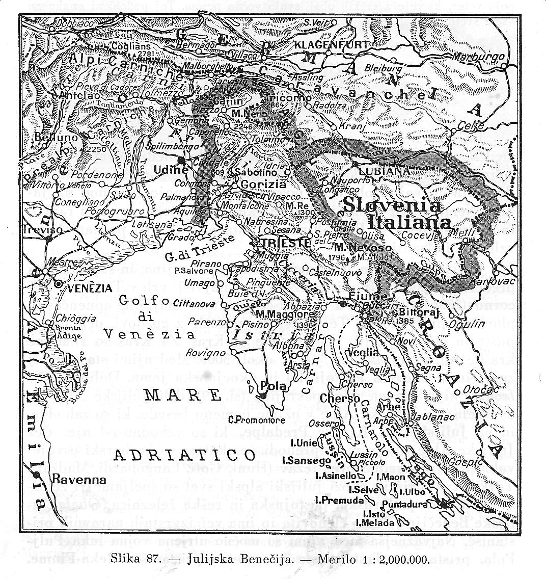 Zemljevid Julijske Benečije – dejansko slovenske dežele Primorske – v učbeniku Zemljepis Italije (za Slovence), izdanem v Torinu l. 1942. Celovitost Primorske je spoštoval celo fašistični okupator